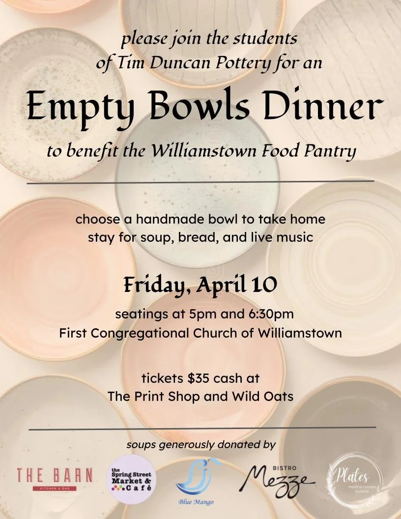Please join the students of Tim Duncan Pottery for an Empty Bowls Dinnerto benefit the Williamstown Food Pantry. Choose a handmade bowl to take home, stay for soup, bread and live music!