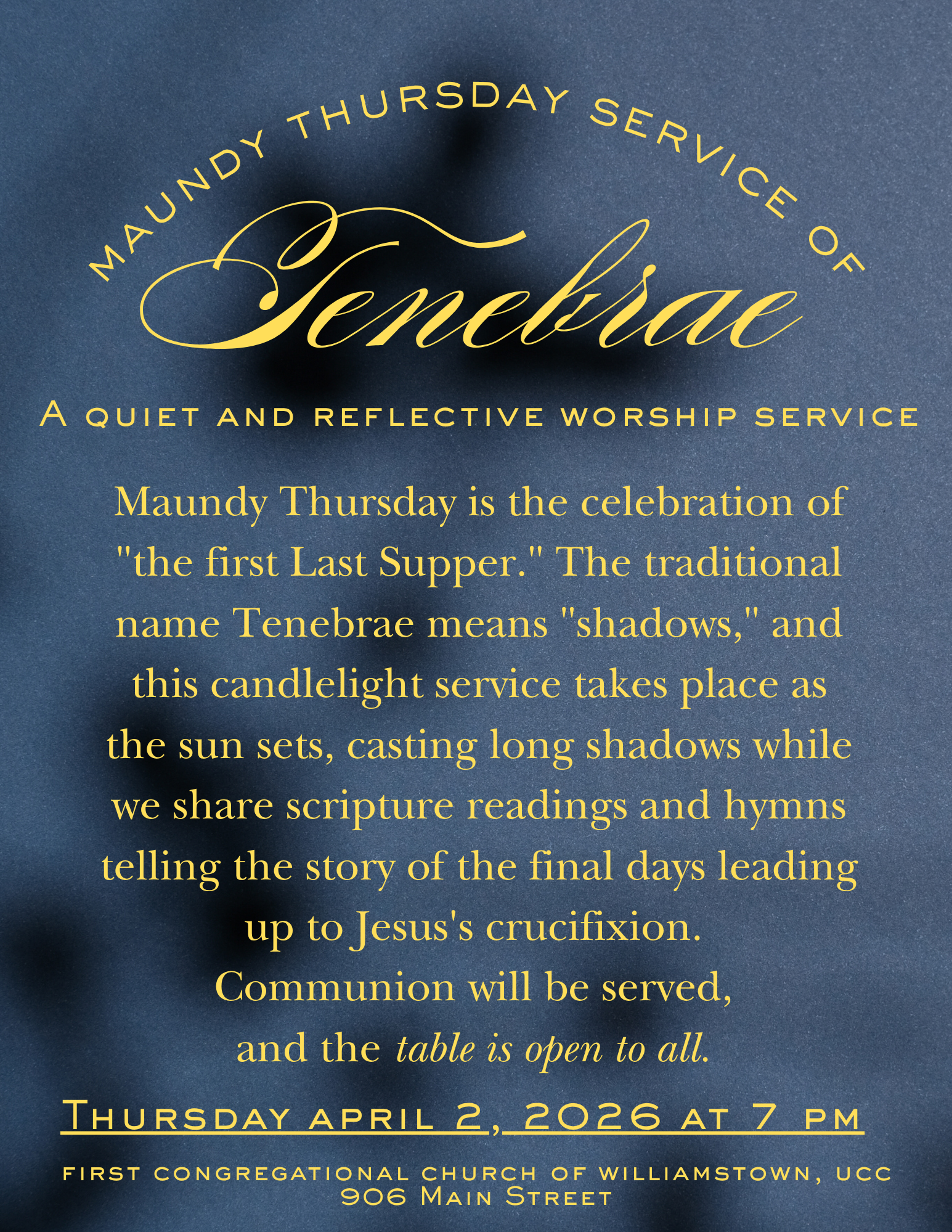 Maundy Thursday Service of Tenebrae A quiet and reflective worship service, Maundy Thursday is the celebration of "the first Last Supper." The traditional name Tenebrae means "shadows," and this candlelight service takes place as the sun sets, casting long shadows while we share scripture readings and hymns telling the story of the final days leading up to Jesus's crucifixion. Communion will be served, and the table is open to all.