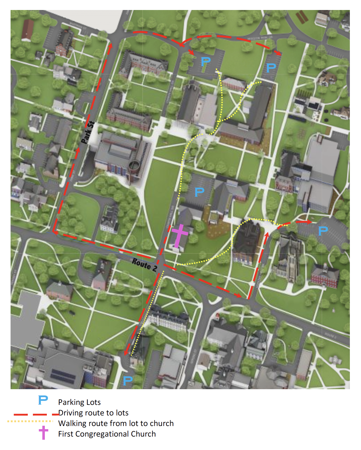 Immediately behind our church building is the church’s parking lot. There are several college parking lots nearby that are available on weekends and evenings. During the week, these college lots are full and reserved for college personnel. You will find additional parking on town streets and at the town parking lot a bit further along on the right side of Spring Street.